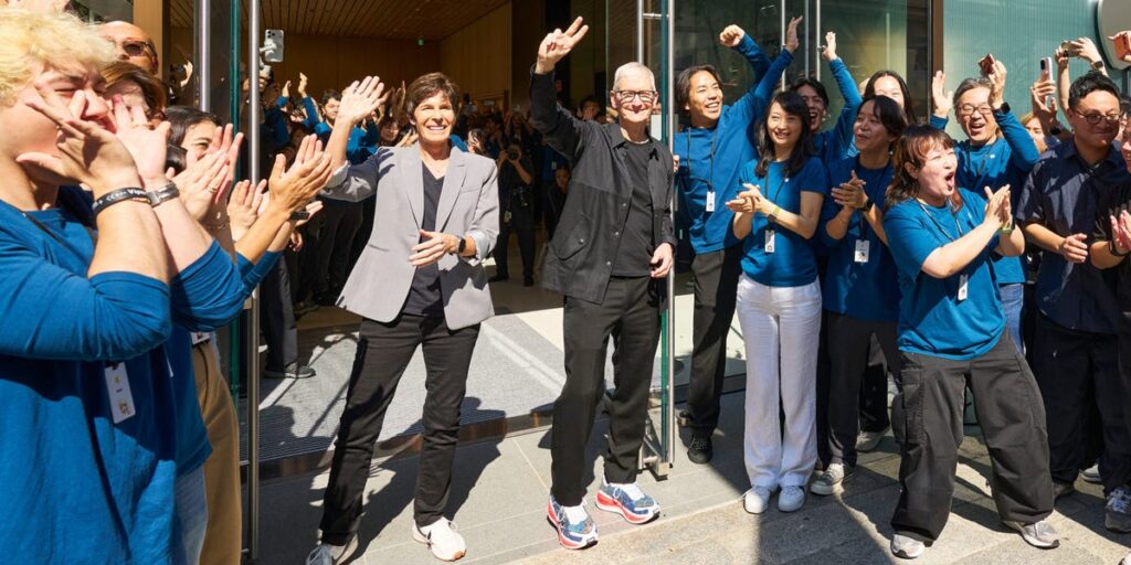 Cook wore a pair of custom Nike Vomero Plus sneakers as he welcomed Japanese customers alongside retail employees and Apple’s senior vice president of retail and people, Deirdre O’Brien. His kicks were designed by Sashiko Gals, an artisan division of the Japanese brand Kuon, the designers told Business Insider.