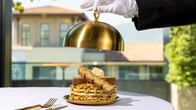The pancakes are buttermilk flavored, but infused with Dubai Chocolate flavors, including pistachio, hazelnut and kataifi (a shredded phyllo dough). The stack is then topped with pricey perks like a massive Dubai Chocolate bar, Madagascar vanilla-infused whipped cream and a shaving of edible 24-karat gold flakes that’s valued at roughly $3,000 an ounce.