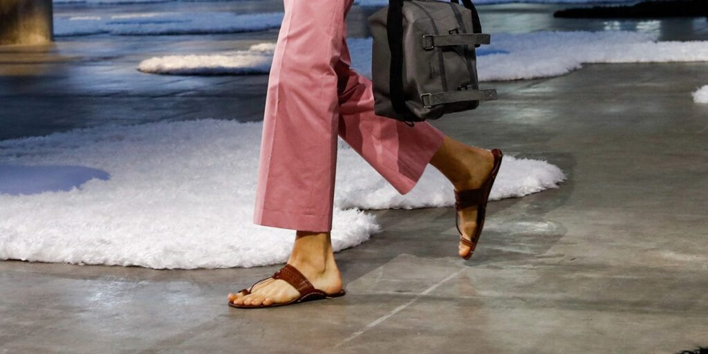 This comes after Prada debuted flat-soled leather sandals, with a thin strap connecting the toe ring to the central belt, on June 22 at its 2026 spring/summer menswear show in Milan.