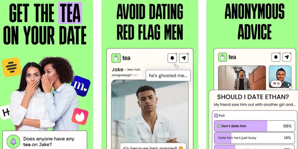 The Tea app allows women to post a “man” (including his name, estimated age, location, and photos) with the option to add commentary. Users can also react to posts with green or red flags. Some users post photos of men asking for “tea” — gossip — about them. Others share posts seeking advice. The app does not allow screenshots.