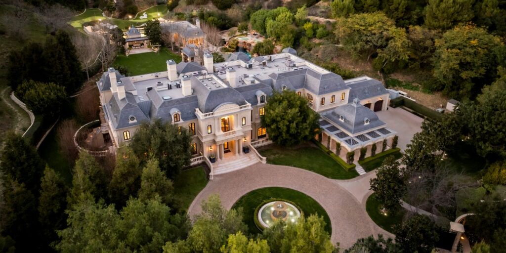 The 30,500-square-foot mansion sits on a 6.2 acre lot and has 12 bedrooms, 20 bathrooms, and a guest house.